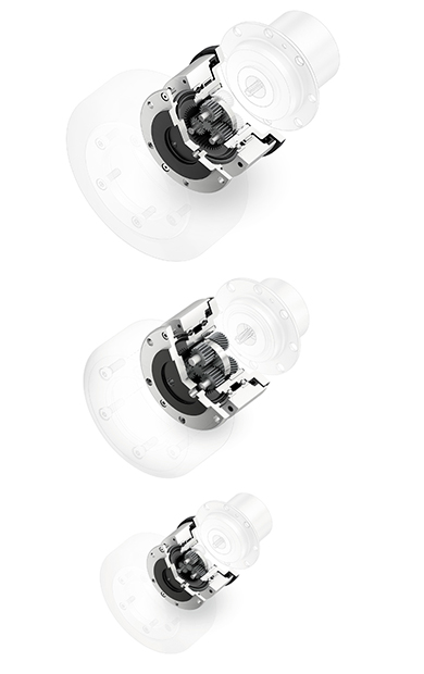 Mit schrägverzahnten Planetenrädern in der ersten Stufe und gerade verzahnten Rädern in der zweiten Stufe wird das Akustikverhalten optimiert. Um das Potenzial der möglichen Bauraumverkürzung maximal auszuschöpfen, befindet sich die Radlagerung bei IMS Drive direkt auf der Außenseite des Hohlrades und nimmt daher axial keinen Bauraum in Anspruch. Zudem führt die Lageranordnung auf dem Hohlrad zu einem optimierten Kraftfluss hinsichtlich Lagerkräften, da der seitliche Versatz der Krafteinleitung zur Lagerung entfällt oder stark minimiert wird. Es entsteht kein Hebel dank der annährend mittigen Anordnung der Lager zum Laufbelag des Rades. Dies wiederum minimiert die Belastung der Radlager und beeinflusst die Lebensdauer positiv.